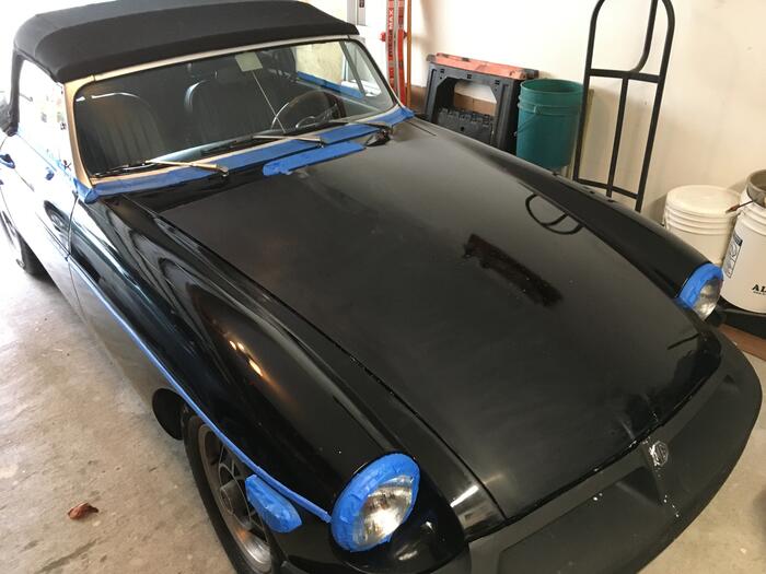 Other half of bonnet wet sanded. The yellow whats it on bonnet is an LED headlamp that helps sort out the orange peel I might have missed.