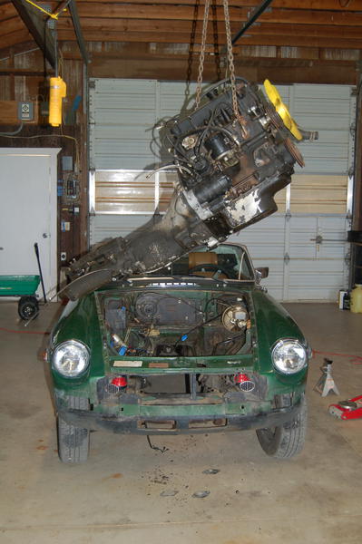 July 6-The first attempt was to try and install a 3.8 Mustang motor- with trans it only weighed about 40lb more than the MG eng/trans and had a perfect shifter location but was too wide- it would have required a completely fabricated front structure & Suspension.