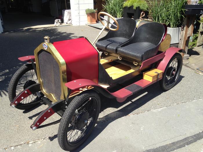 This one started out as two old MG badges and a spare Morrie eight grill I had lying around. Two achieve some resemblance to the original it needed to have the steering wheel on the right side giving the appearance of a two seater.