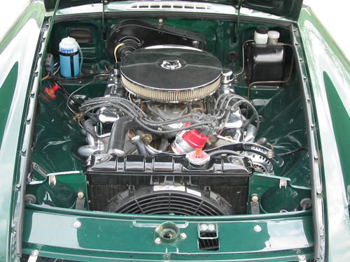A '64-'65 stock Mustang radiator was located in front of the stock anti-sway bar location on hammer formed mounting brackets. The stock oil cooler panel was removed and a custom fabricated pan was installed to allow air to flow to the full length of the taller Mustang radiator.