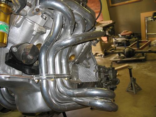 I wanted the exhaust to fit inside the car and was reluctant to cut the inner wings. This requirement forced me to come up with some method to snake all this pipe down and around the starter and steering. I first maximized the space available by making motor mounts that left as much space as I could get between the starter and the oil pump and moved the chassis mounts as far forward as needed. I then found some flexible plastic conduit (a corrugated product used to run communication cable) that I cut to 38" lengths. I fabbed up a temporary sheet metal exhaust flange to hold the plastic tubing to the head's exhaust ports and began to bend the plastic to the shape needed to worm down through the available space. To get the plastic tube to come together at the same point (representing the point that the tubes would join the the collector), it became apparent that I would need to loop some of the tube outward below the chassis "frame" below the inner wing. Then it also became apparent that I would need to have a break-joint to allow the headers to be removed while installing the engine. (In practice, I am able remove the bottom portion and leave the upper portion attached to the heads while installing or pulling the engine). I set the flex conduit in position using a heat gun and removed it to begin to fab the header in steel, copying my bends in steel tube. I made exhaust flanges from a sheet of 5/16" mild steel, and started on the tubes. After many hours of cutting and fitting and tack welding, then repeating on the next tube I had one side completed. The tubes were then removed from the exhaust flange and TIG welded to completion. The assembled tubes were then brazed to the flanges and welded to the collector. After having a shop grind the flanges flat, They were sent to Jet Hot Coatings to be ceramic coated. They were mounted to the heads with .060 thick asbestos-paper hand-cut gaskets.