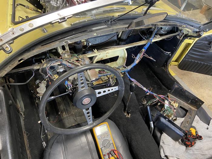Running much better now so decided to focus on putting the console back in and wiring switches and lights up. Hazards weren’t working when I bought the car and had it towed home. At the time, I put a battery in and confirmed it was going to be a worthwhile project so it went right into the garage for a clutchectomy and lots of might as well jobs. Got the hazard switch wired up but fused brown wire to the switch was dead. Further investigation and the wire is toast up into the loom behind the dash. The PO had a cobbled up stereo installation in the console. Now I know why the radio didn’t work and the hazards as well. So it’s dash removal time.