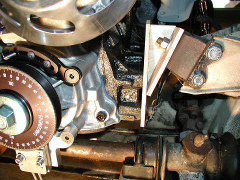 With the body off and the engine hanging from a chain hoist, the frame was altered for clearance. The Spitfire motor mounts were used and transition piece was mocked up out of wood to mate up with the engine mounting points. The weight was held up by the hoist during the mock up. When I was satisfied the mounts were made out of metal. Also mocked up at this time was the alternator mount.