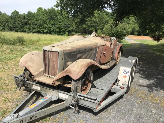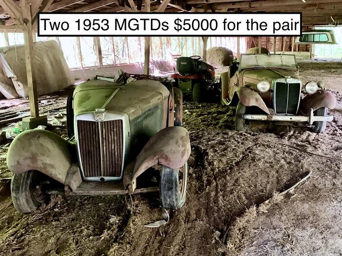 I have two 1953 MGTDs that I purchased from a friend about five years ago. They were his late father's cars, and had been in a barn for 35 years. The building was about to come down, so I rescued them and moved them to my family's property in Ramseur, North Carolina, which is where they have been since (see photos). I am now residing in Texas, and am not in a position to restore them myself any time soon. So, in order to see them get back on the road where they belong, I’ve decided to sell both. I have the titles in hand for both cars, which the previous owner had since ’57 and ’69. Both need total restoration but all the parts are there. When checked in 2021, both engines were free and not frozen. I haven’t gone over them with a fine-toothed comb, but the frames appear solid, sheet metal has superficial rust, no apparent holes. Obviously, all of the wooden components would need to be replaced. Both appear restorable, or you could make one out of the two. All of the parts missing on the black car are in the vehicle, removed by the former owner. Other than moving them, I’ve personally done nothing with them, living out of state and unable to manage them. I have more photos of the removal, relocation, and current location. My elderly mother resides on the property, so my brother has agreed to help me broker any interested parties viewing/purchasing. Any buyer would need to facilitate the moving of the vehicles with a trailer or carrier. $5000 for the pair…I’d like to keep them together but would consider separating them. Serious inquiries only, no low ball offers. Let me know if you are interested by contacting me via direct message, and thanks! Hope to see them get into the right hands!