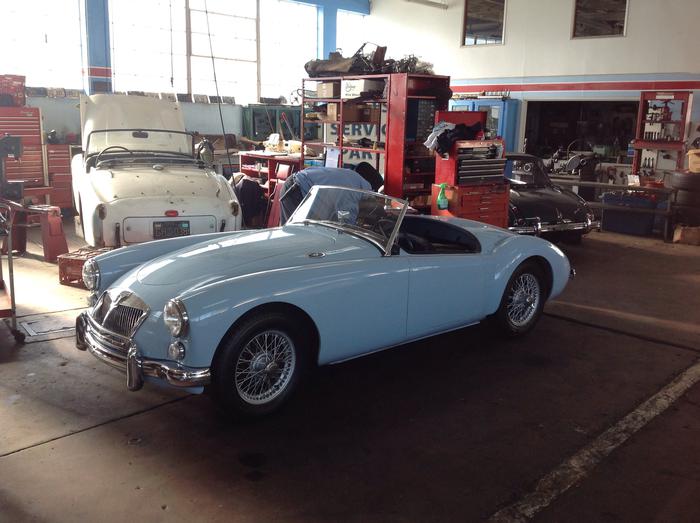 Deep Blue Pearl with tan interior and a new black Robbins convertable top. 72 spoke chrome wire wheels. It looks great !!!