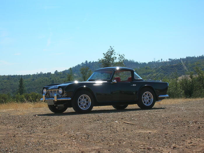 Original surrey top car, original wood dash, now with black exterior and red interior, 72 TR6 seats, Panasport wheels.