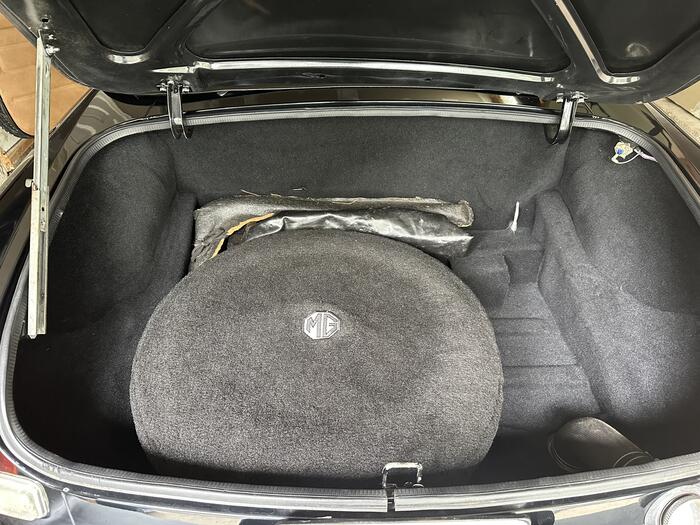 Equipment includes a leather-wrapped steering wheel, front air dam, chrome rear luggage rack, silver body side striping, black soft top, Zenith Stromberg carburetor, 14" alloy wheels mounted with 185/70 Sumitomo tires, matching spare wheel with an older Dunlop tire stored in the trunk, Limited Edition MG dash plaque, fog lights, black impact bumpers, mud flaps, cup holders, custom made wooden shift knob, Pioneer stereo with CD player, Sony after-market door mounted speakers, black boot cover and black tonneau cover.