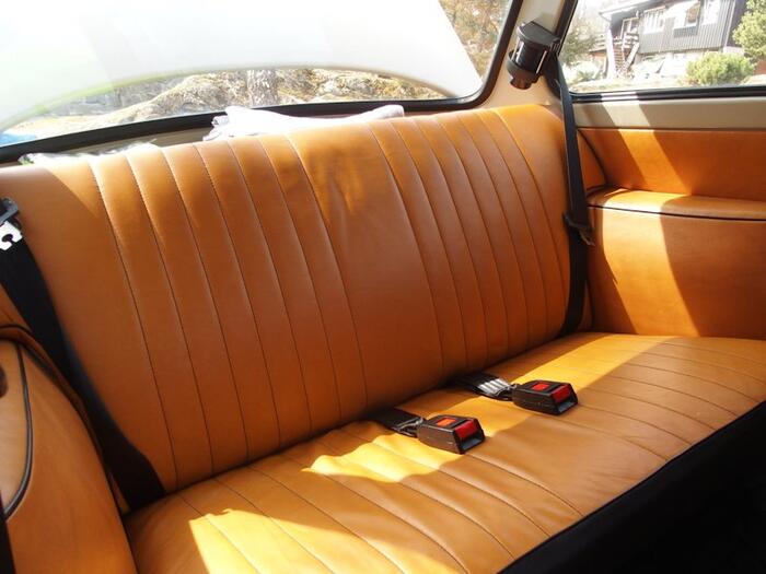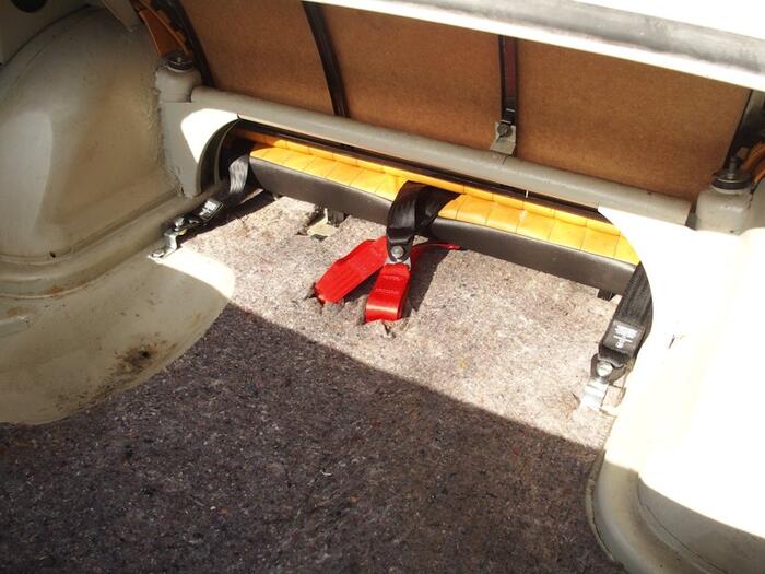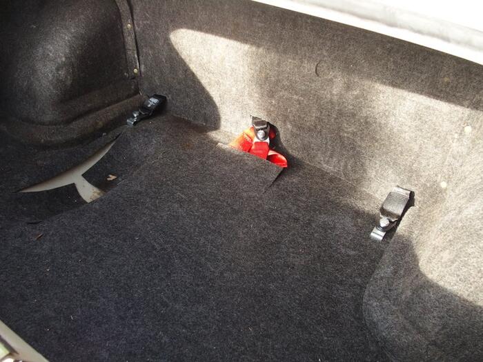 Rear seat belts Trabant 601: My Trabant has mounting point holes in the rear pillars but no captive nuts. I inserted captive nuts into the pillars to fit the belts to the rear pillars. I drilled holes in the boot floor as per the instructions for fitting Doblina lap seat belts. SECURON three point belts were used with belt extenders for the belt clips in the middle of the seats and short metal extenders for the outer belt ends. The reels are designed to be mounted at shoulder height and can be adjusted to work at any angle. This means that there is no chance of the reel getting snagged or obstructed by items in the boot.